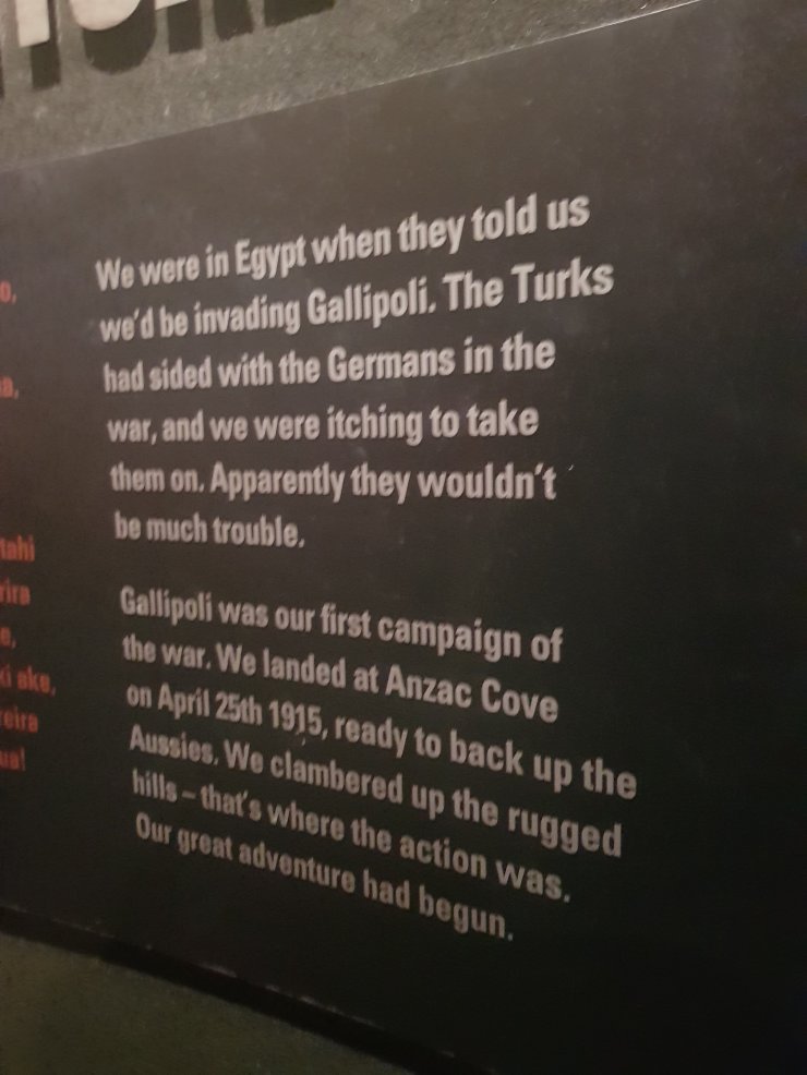 Wer Neuseeland besucht sollte sich auch mit der Geschichte des Landes befassen: Das national museum ( Te Papa) bietet den geeigneten Ort dafür. In wechselnden Ausstellungen kann man sich mit den Kriegen in denen Neuseeland beteiligt war befassen. Beim meinem Besuch wurde die Schlacht von Gallipoli befasst haben, die im 1.Weltkrieg vor allem zwischen türkischen und britischen Soldaten unter australischer und neuseeländischer Beteiligung geführt wurde. Mit einer atemberaubenden Visualisierung erzählt die Ausstellung die Geachichten der gefallenen Offiziere und Soldaten-durchaus verherlichend, aber auch auf die Schrecken des Krieges eingehend. In einem anderen Stockwerk findet man Infos zur Naturgeschichte wie den ausgestorbenen Tieren, neuseeländische Einwanderungsgeschichte und Flucht und Migration heute. Auch Kunst und Kultur der Maori wird gezeigt.