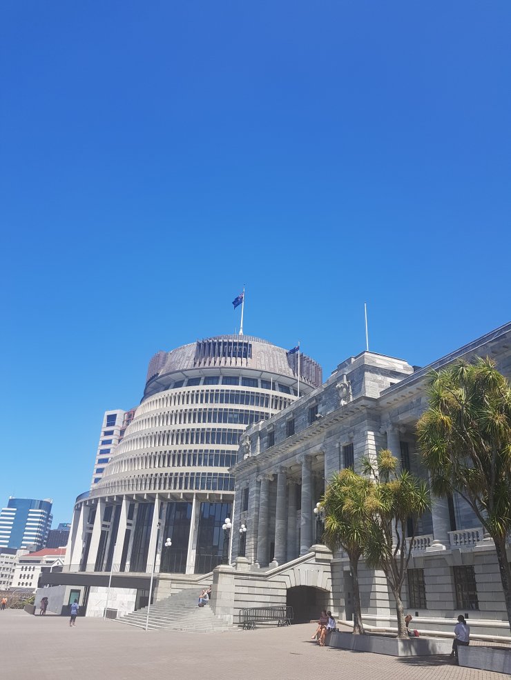 Als Hauptstadt ist Wellington auch Sitz der Regierung und des Parlamentes. (Einen ausführlichen Beitrag zum politischen System Neuseelands folgt später.) Der bienenstockartige Bau ist Sitz der Premierministerin und ihrer wichtigsten Minister*innen. Rechts daneben befindet sich das Parlament und die Parlamentsbibliothek.